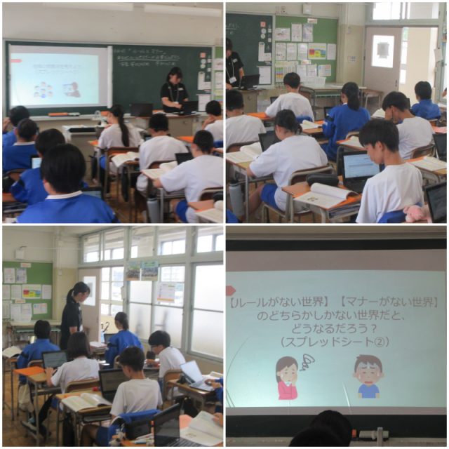 SNSの使い方のお話をもとに、ルールとマナーについて考えました。相手の権利や気持ちを大切にしながら生活していこうという意見がたくさん聞かれました。