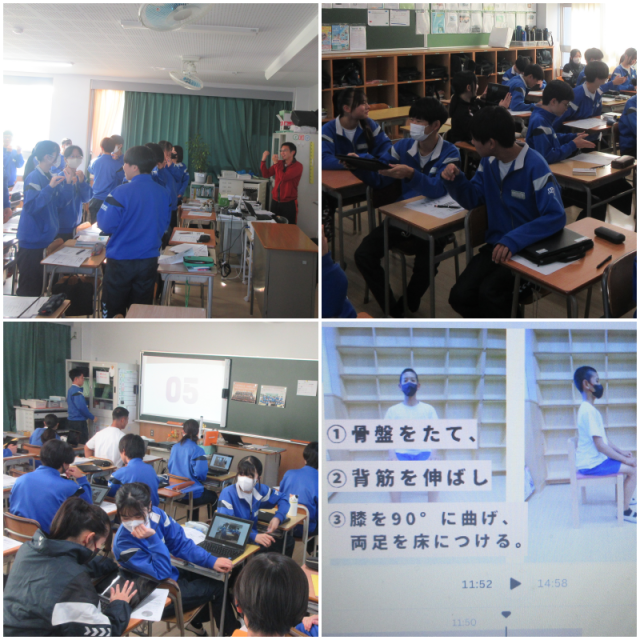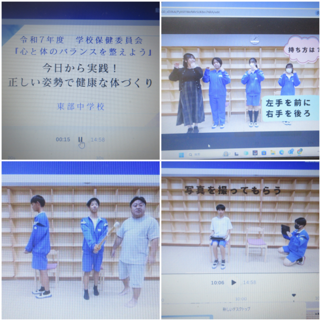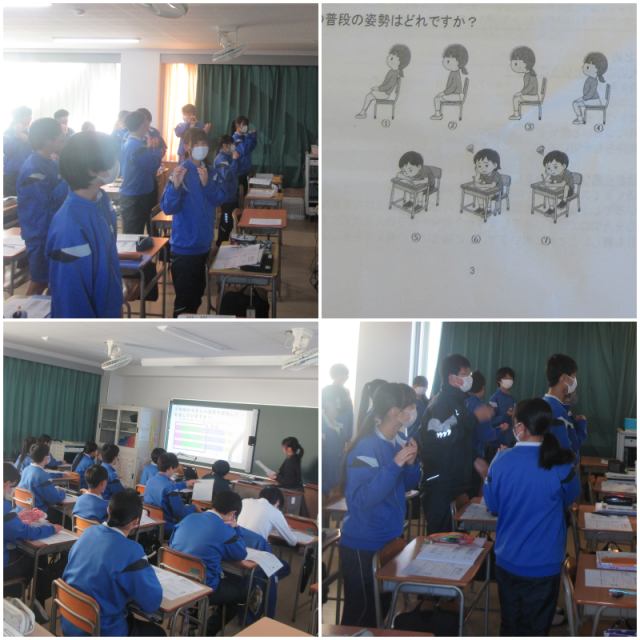 今朝の集会の時間では、各クラスで動画を視聴しながら「今日から実践!正しい姿勢で健康な体づくり」をテーマに、学校保健委員会を行いました。フルートを演奏する姿勢、剣道での構え、授業中の椅子の座り方について、実践を交えながら正しい姿勢について皆で考えました。姿勢が良いと気持ちがすっきりしたり勉強に集中できたりします。ぜひ、これからも実践してくださいね。