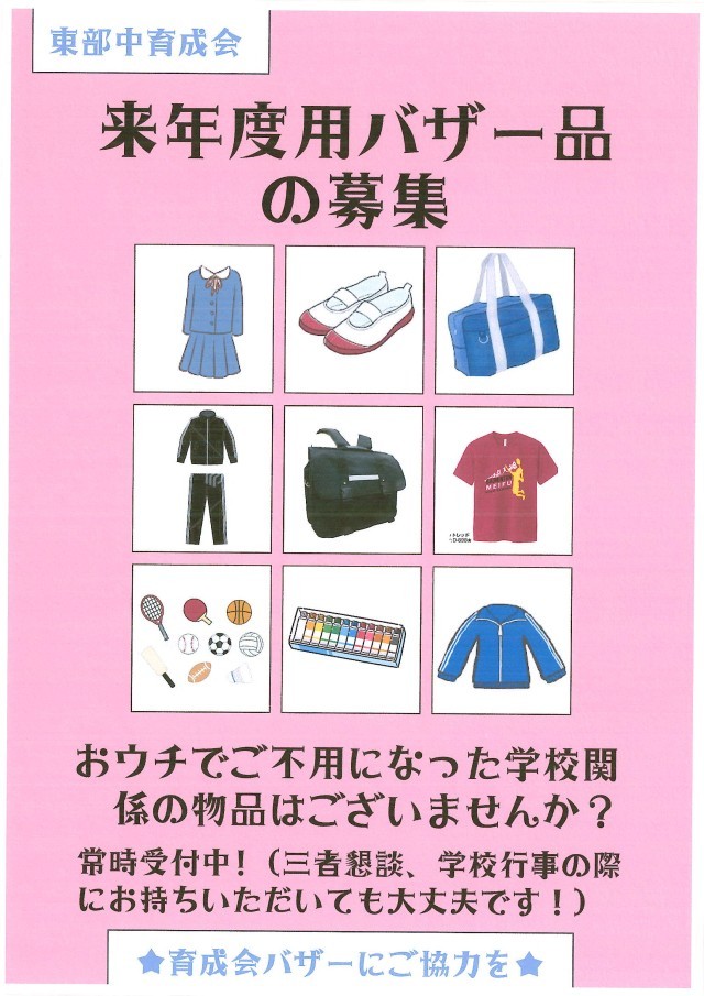 東部中ではバザーのための学校用物品を常時募集しています。ご不要になった学校関係の物品を東部中までお持ちください。お子様を通してでも、三協力をお願いします!