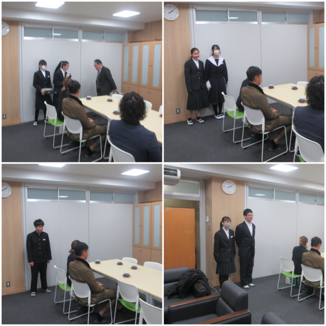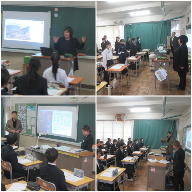 職業講話会では8つの業種の方に来ていただきました。写真は、ホテル業、スポーツクラブ経営の方のお話の様子です。会を進行するにあたって担当の生徒が講師のご案内もしました。