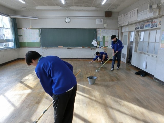 ワックスがけ 公開日 2025/12/19 更新日 2025/12/19 お知らせ 12月18日、19日とワックスがけがありました。床のゴミを取り、水拭きで汚れもしっかりと落とした後、モップでワックスを塗っていきました。塗り残しが無いように丁寧に塗ってくれており、安全に過ごせる学校環境にしてくれました。