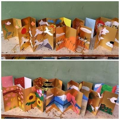 1年美術作品 「和の心」(四曲屏風) 公開日 2026/01/08 更新日 2026/01/08 お知らせ 1年の美術、単元名「和の心」で四曲屏風を作成しました。事前学習として屏風についてその種類、歴史的な用途、現代の用途等について調べた上で制作にあたりました。四面を関連したテーマで描いたもの、二面ずつ関連させたものなどの工夫が見られました。また、背景が金色なのでその背景色を活かした配色を考えた作品も多く見られました。