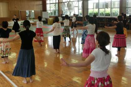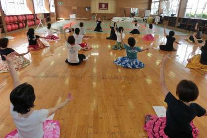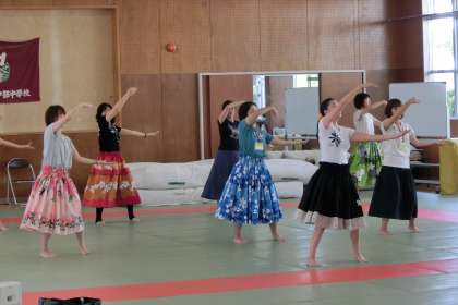 今回は「心とからだの癒し」をテーマに、フラダンスを体験しました。講師の大江忍さんに、基本のステップから教えていただき、1曲分を踊れるように練習しました。