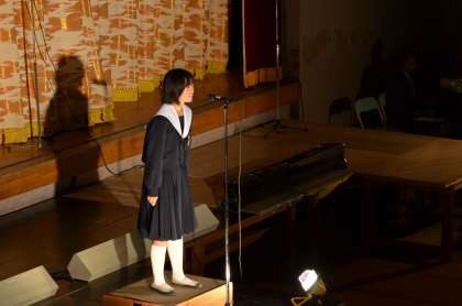 文化祭〜英語弁論〜 公開日 2013/10/28 更新日 2013/10/28 学校行事 英語弁論の発表です。 一人目は『The Fall of Freddie the Leaf(葉っぱのフレディ)』 二人目は『Brass Band Club(吹奏楽部)』 の発表でした。 2人ともとてもキレイな発音で、丁寧に表現していて、素晴らしい発表でした。