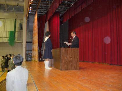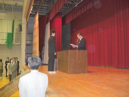 修了式 公開日 2008/03/25 更新日 2008/03/24 学校行事 平成19年度修了式が3月24日(月)に行われました。校長先生から、1・2年生に修了証が渡されました。また、校長先生のお話では、この1年で、落ち着いた雰囲気で式や授業を行うことができるようになったということと、あいさつの声が大きくなったというお話がありました。また、今年一年を振り返り来年度の目標を持ちましょう。テレビとかではなく多くの「生」に触れ、あこがれの人や夢をもちましょうというお話がありました。