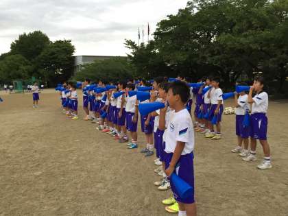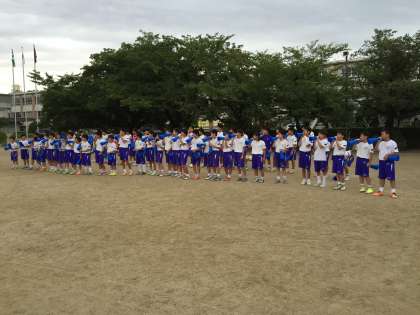 サッカー部は試合に向けて、応援の練習をしていました。メガホンを持って、大きな声で声援を頑張っていました。