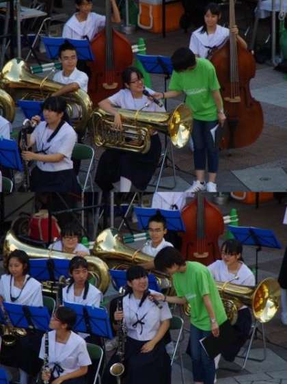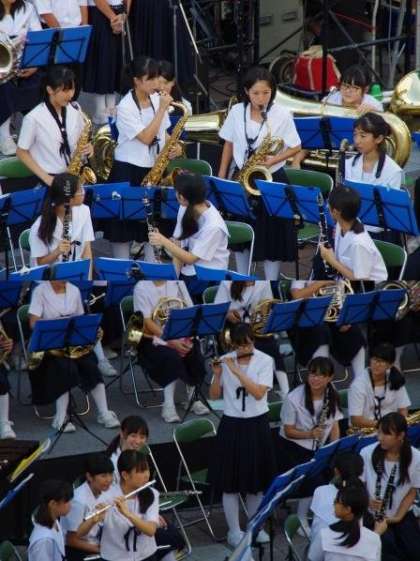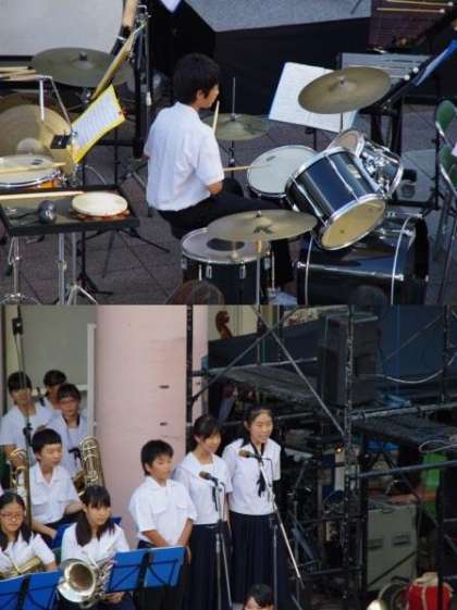 今日は勝川商店街の納涼祭りでした。駅の前で行われた第10回納涼音楽祭に、昨年に引き続き本校吹奏楽部が参加をさせていただきました。