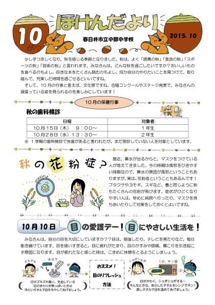 今月号の表面は、「秋の歯科検診の予定」「秋の花粉症」「目の愛護デー」についてです。