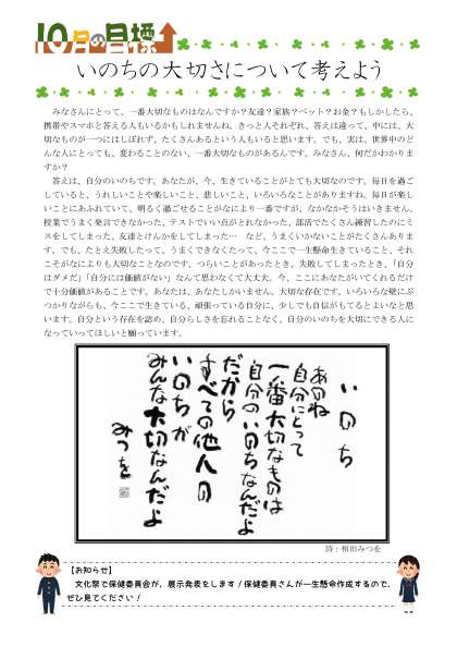 裏面は、先日の集会でも保健委員が発表をしてくれた、10月の保健目標です。今月の目標は、「いのちの大切について考えよう」です。一番大切な「いのち」について、ご家庭でも話し合っていただければ、と思います。