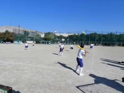 運動場からなにやら歓声が聞こえてきました。運動場では男子が走り高跳びを行っており、一段と大きな声はその奥で行われていた女子のソフトボールでした。慣れない競技ですが、みんな一生懸命に、そして楽しそうにプレーしていました。