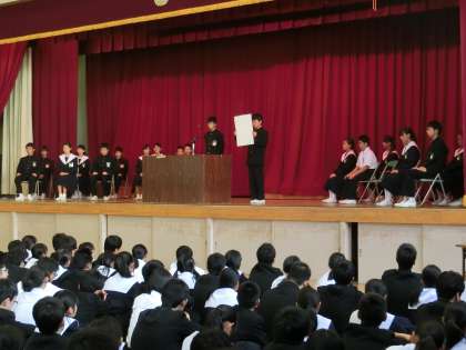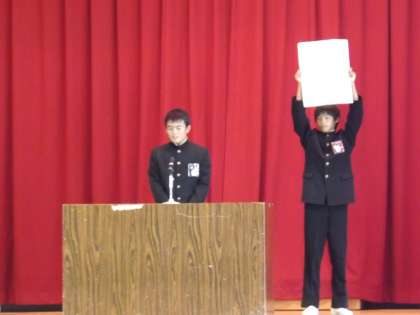 後期生徒会役員選挙 公開日 2015/10/15 更新日 2015/10/15 学校行事 本日、後記生徒会役員選挙が行われました。今回の選挙では書記に3組、会計に5組の立候補があり、それぞれ定数が2組ずつなため、選挙後に決選投票が行われました。自身の抱負を熱心に語る姿に、あたたかい拍手が送られました。
