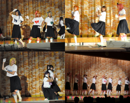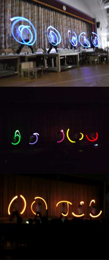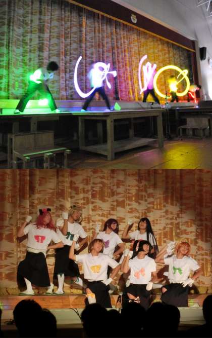 文化祭 2日目(幕間1・2) 公開日 2015/10/23 更新日 2015/10/23 学校行事 1、2番目の幕間の様子です 幕間1:まな板 幕間2:CHUBU 「まな板」は、サイリウムを使用した華麗なパフォーマンスを、「CHUBU」は個性豊かな衣装をまとい、息の合ったダンスを披露してくれました。
