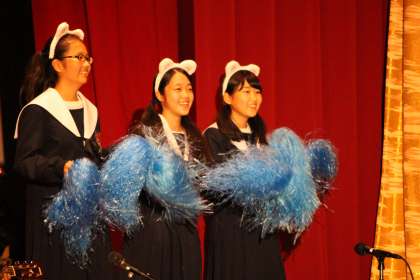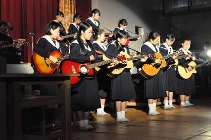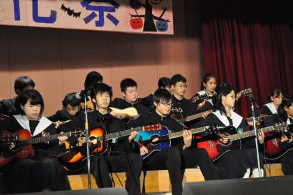 文化祭 2日目(ギター部その1) 公開日 2015/10/23 更新日 2015/10/23 学校行事 午前の部ラストを飾ったのは、ギター部の演奏でした。 流行りの楽曲やスクリーン映像、曲に合わせた踊りなどに体育館内はより一層活気づいていました。