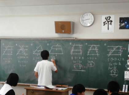 2年生の教室と調理室を行き来している時に、3年生教室を通ったら数学の授業で、黒板に出て解答をしている場面があったので、思わず一枚撮影しました。相似の問題かな?