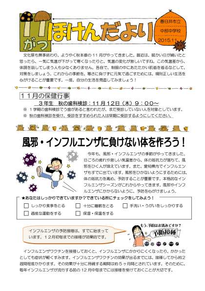 11月号は、インフルエンザにかからない体作りと生活習慣について掲載しました。体力向上と毎日の睡眠やうがい、手洗いなどに積極的に取り組んで、予防をしましょう。