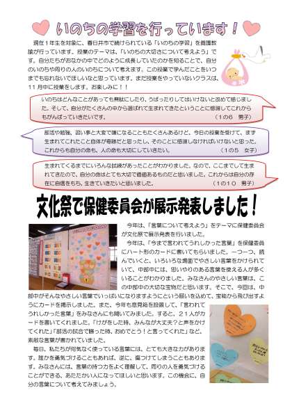 裏面は、「いのちの学習」の授業について掲載されています。自分と周りの人の命につて考える機会をたくさんつくっていたいと思います。そして、もう一つ文化祭で保健委員会が展示した「言葉について考えよう」についての記事を載せました。