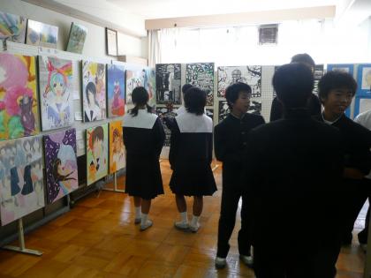 展示鑑賞 公開日 2008/10/29 更新日 2008/10/28 学校行事 10月28日、文化祭で展示鑑賞を行いました。 下はそのときの様子です。 今年は3号館で行いました。 みんな作品にとても興味を持って見ていました。