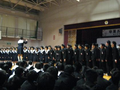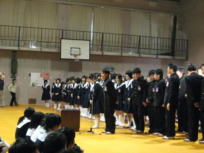 卒業生を送る会(6) 公開日 2009/03/04 更新日 2009/03/03 学校行事 3年生から在校生に向けて。 様々な思いを胸に、「春に」という曲を贈ってくれました。 素晴らしい歌声に3年生の暖かい気持ちを感じました。