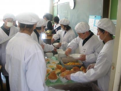 給食当番の生徒は、戸惑いながらも一生懸命配膳していました。
