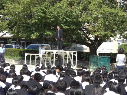 10月5日(金)の避難訓練の後に、新しい先生の紹介がありました。 社会科の稲垣先生です。よろしくお願いします。