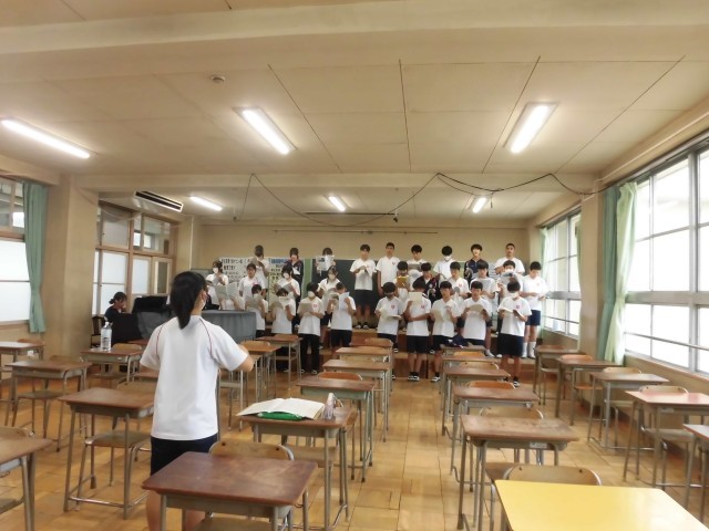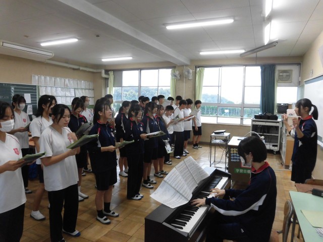 朝の雨が少しずつ止んできて、雲の切れ間から晴れた空が見え始めました。このまま天気が回復に向かうことを願います。本日朝のSTの時間の様子です。10月下旬の合唱コンクールに向けた練習が本格的に始まっています。いつもの朝読書の時間が、合唱練習の時間となっています。上段は1年生の様子です。教室だけでなく、廊下にも生徒達が出て練習する様子が見られました。中段は2年生です。写真のクラスでは、教室でピアノが使える日となっており、全体で伴奏に合わせて声を出しています。下段は3年生です。音楽室で練習をしているクラスがありました。自分達で合唱が進められており、最高学年としての熱意を感じました。本番は、10月23日(木)の文化祭にて行われる予定です。体育館で発表されるそのときを、心待ちにしています。がんばってください。