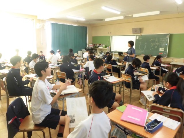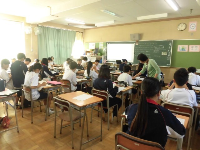 合唱コンクールの歌声が校舎内に響くことが増えてきて、文化祭に向けた意気込みが日増しに強くなっていくのを感じます。本日4時間目の授業の様子です。1段目は1組です。質量の変化などを確かめる実験を、ロウを使って行っていました。写真の場面は、丁度実験を終えて、まとめに入るところでした。2段目の2組は体育(剣道)です。胴の打ち方について全体で確かめながら、繰り返し繰り返し練習をしていました。3段目の3組は英語です。ペアでお互いに発音する練習をしているところでした。4段目の4組も英語です。各自で問題に取り組む時間となっており、先生から教わったり、お互いに相談したりしながら、解答に取り組む姿が見られました。