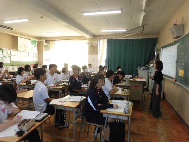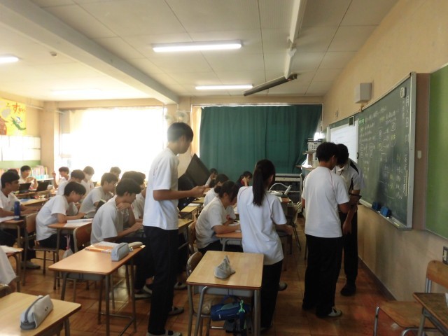 台風の接近が気になる今日この頃ですが、その中で今日は日差しが強く、久しぶりに汗ばむ陽気となりました。急な暑さで体調が崩れないよう、こちらも気をつけて見ていきたいと思います。本日4時間目の授業の様子です。上段の1組は理科です。慣性の法則について学ぶ授業で、この場面は丁度各自で学習を進めているところでした。個人で、あるいはグループで、生徒達がタブレットPC等を用いて学習を行う様子が見られました。中段の2組は社会です。公民の学習が裁判について学ぶところまで進んでいました。裁判の種類について、各自が内容をまとめています。先生のところへ行って質問をする生徒も見られました。下段の3組は数学です。図形の辺の長さについて、比を使って求める問題を解いていました。先生が生徒と対話を重ねながら、解くためのポイントについて、気づかせようとする様子が見られました。