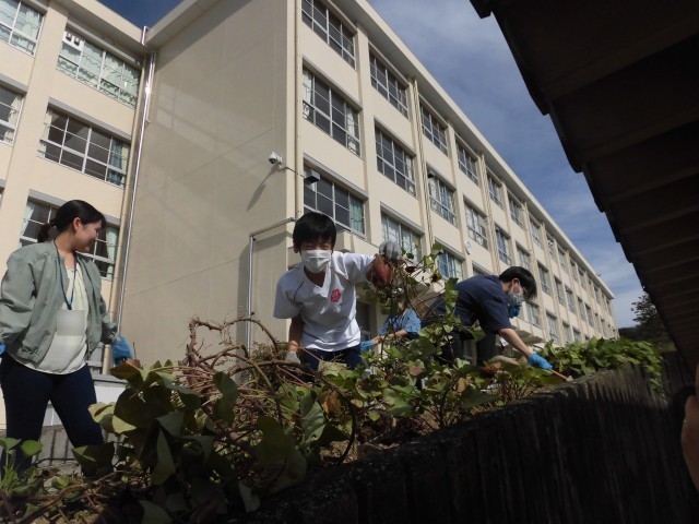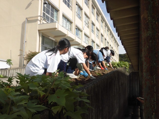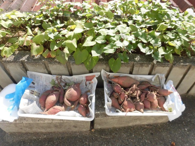午後になっても太陽は燦々(さんさん)と輝き、スロープで作業していると日差しとコンクリートの照り返しでかなり暑かったです。本日6時間目の授業の様子です。678組の生徒達が、ここまで大切に育ててきたサツマイモの一部を収穫しました。生徒と先生たちが、額に汗を浮かべながら、イモを傷つけないように丁寧に掘り進めました。大きいものが収穫できた時の笑顔は、日差しに負けないくらい輝いていました。