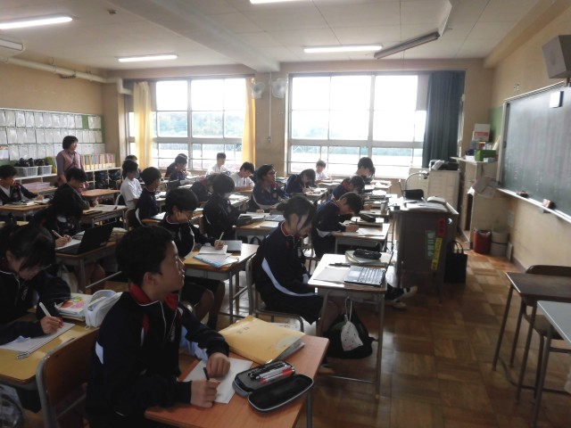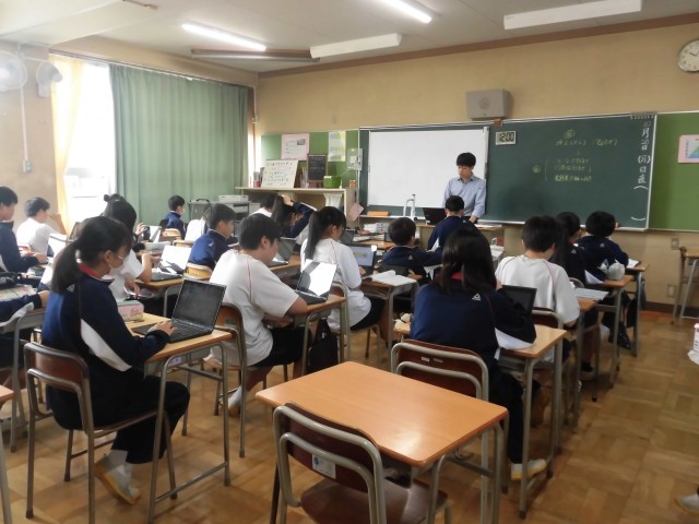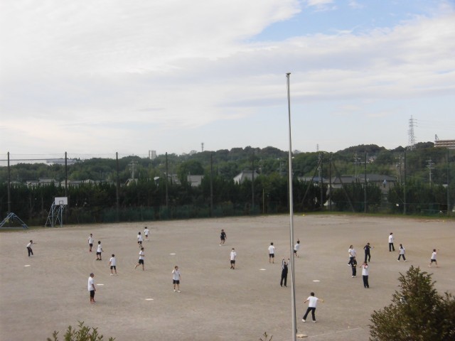 雲の晴れ間に青空が見えてきました。天気予報ですと今日は午後にかけて晴れていくようですが、一方で空気も乾燥していくようです。空気が乾燥するのもまた体調にとって心配なところなので、こちらも気をつけて見ていきたいと思います。本日2時間目の授業の様子です。1段目の1組は社会(歴史)です。国風文化について、教科書から必要な情報を読み取り、まとめる姿が見られました。2段目の2組は体育です。ソフトボールが始まりました。まずはキャッチボールをしてウォーミングアップをする様子が見られます。3段目の3組は国語です。黒板に書かれた内容を、静かにノートに写している場面でした。4段目の4組は数学です。ここまでの学習内容を振り返り、タブレットPCに各自で入力していました。