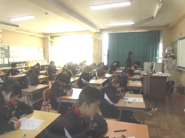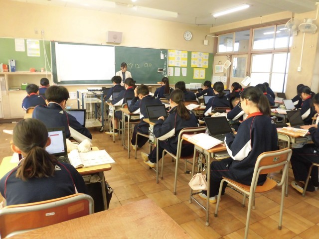 朝晩が以前よりも寒くなったと感じます。生徒達の服装も、すっかり長袖が多くなりました。エアコンも暖房に切り替えて動かせるようにしておきたいと思います。本日3時間目の授業の様子です。1段目の1組は数学です。パフォーマンス課題を、生徒達が協力しながら考えていました。2段目の2組は家庭科です。生徒が各自のポートフォリオにタブレットPCを使って黙々と入力をしています。3段目の3組は英語です。単元テストを行っているところでした。静かに集中しているのが、ドア越しに伝わってきます。4段目の4組は国語です。説明文の読解を全体で行っていました。先生の問いかけに多くの手が上がる様子が見られました。