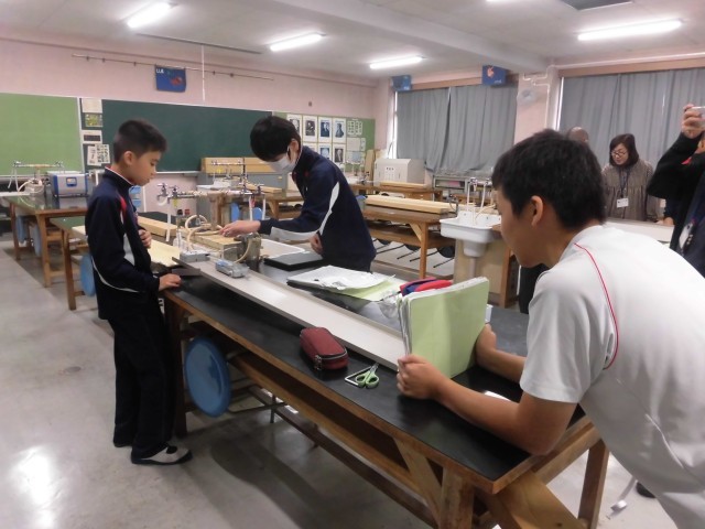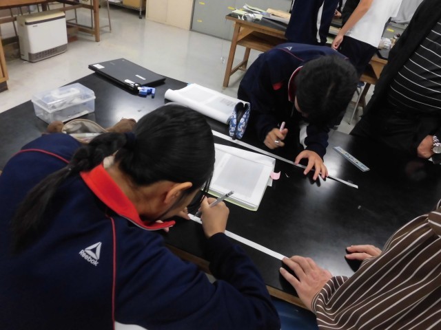 朝から曇り空ですが、雨が降るのは午後からという予報のようです。生徒達の下校に重ならないかが心配です。本日4時間目の授業の様子です。理科室で物体の運動について実験をしました。傾斜をつくって台車を走らせ、その動きをテープで記録します。記録されたテープを切り分けて並べてみると、傾斜を下る中で、徐々に速度が上がっていったことが分かりました。実験中もさることながら、きれいに階段状になったグラフを作れたときの生徒達のうれしそうな表情が印象的でした。