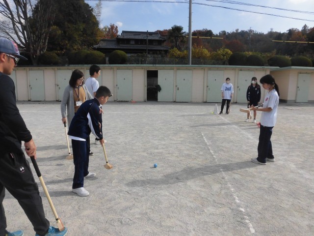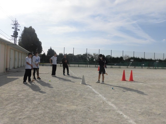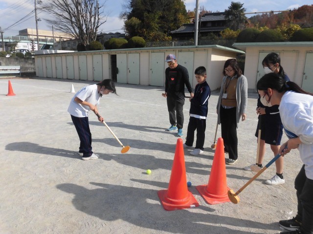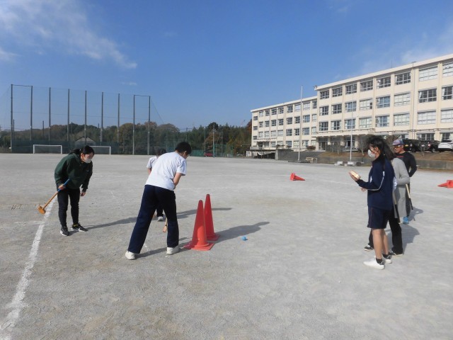 今日は風も穏やかで、日差しの温かさをじっくりと感じられる陽気となりました。その中で、本日4時間目に「グラウンドゴルフ」を体育にて行いました。コーンの間を狙ってボールを生徒達が一生懸命打っています。先生もメンバーに入って2チームで対戦しており、ボールがコーンに近づく度に歓声が上がる盛り上がりです。メンバーの活躍により逆転ができる場面もあり、声を掛け合ったり、一緒に喜び合ったりする場面など、微笑ましい姿が見られました。