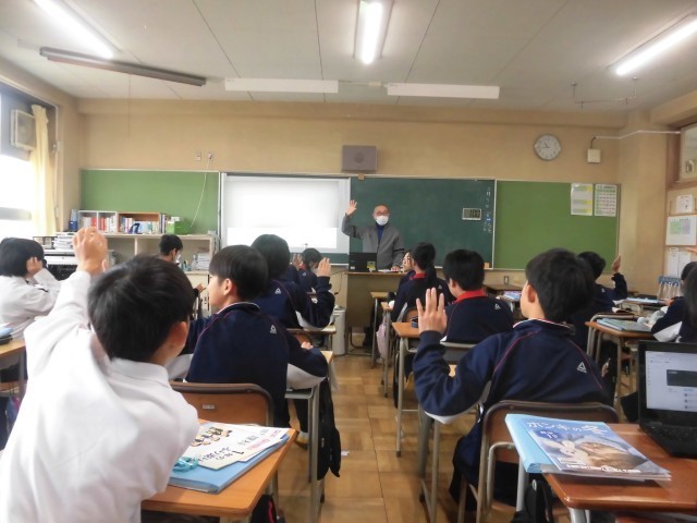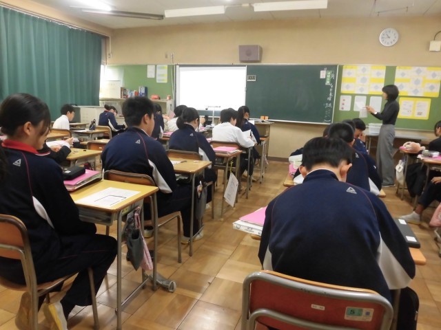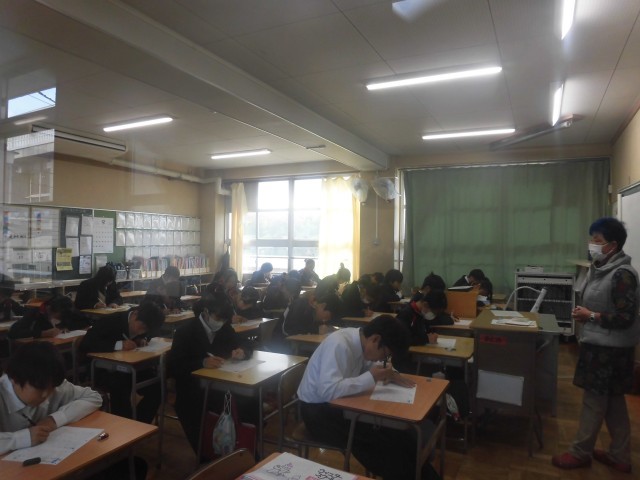 寒い寒いと思っていたら、雨まで降ってきました。どうか生徒の下校のときには止んでいてほしいと切実に願います。本日3時間目の授業の様子です。1段目の1組は美術です。漢字の一部をイラストにした絵文字の製作に入っています。各自の創造力がユニークに表現されていて、見ていて興味深いです。2段目の2組は英語です。先生に続いて英語の発音をしています。先生の発音と同じように声を出せる生徒が増えてきていて、習得を感じます。3段目の3組は「音」について学習していました。高さの違いによって聞こえ方が変わることを確かめるため、先生用のPCから、様々な高さの音を出しています。聞こえると生徒達が手を上げて答えたり、その高さの音から湧いたイメージを伝えたりする姿が見られました。4段目の4組は国語です。単元テストの最中でした。テストを受ける姿勢も半年でしっかり定着しており、静かに集中して取り組む様子が見られました。