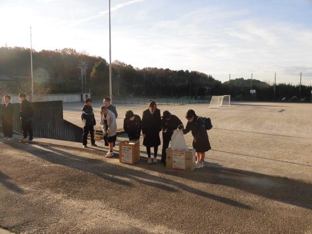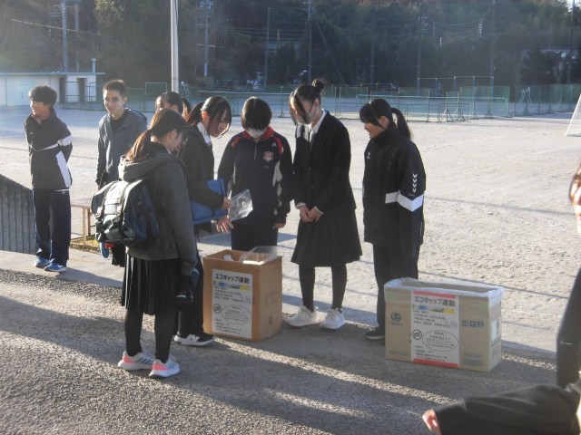 日がゆっくりと校舎を照らし始めた本日の朝に、あいさつ運動と生徒会によるエコキャップ運動が行われました。いつもの挨拶の声に加えて、ペットボトルのキャップ回収の呼びかけが重なり、寒さを忘れるほど温かい光景となりました。ありがとうございます。エコキャップ運動は今週金曜日まで実施し、収集したキャップを発展途上国のためのワクチン代として寄付する計画です。まだ寒さは続きますが、こちらもどうかがんばってほしいと思います。