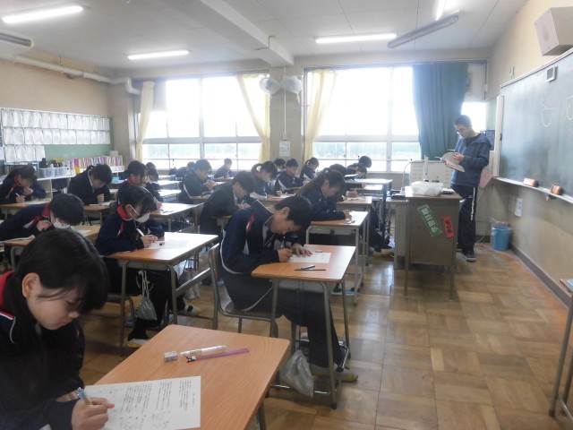 寒波の影響が大きく、残雪の見られる連休明けとなりました。校舎回りを歩いていると、雪の積もった木々や階段などが見られます。寒さだけでなく、安全面にも気をつけていきたいと思います。本日1時間目の授業の様子です。1段目の1組は国語です。新しい単元に入り、単元の目標と取り組みについて、先生から説明を聞いているところでした。2段目の2組は理科です。小テストを受けています。静かに筆記用具を走らせる音だけが響いています。3段目の3組は家庭科です。日本の食文化について、各自が調べた内容を班で発表し合っている様子が見られました。4段目の4組は体育です。今日からはダンスの授業ということで、まず動画で実際の動きを確認しているところでした。この確認を踏まえて、練習が始まるそうです。本番が、楽しみです。ぜひがんばってください。