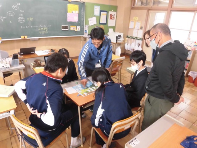 今日は少し寒さが弱まるらしいと聞いていたのですが、廊下は依然として寒いです。明日からまた寒気が流れ込むと予報が出ているので、しっかり備えておきたいと思います。本日3時間目の授業の様子です。理科の授業で、生物の「食物連鎖」について学びました。カエルの話題を発端にして、そこからカエルが生きる環境や関わる動物について、意見を生徒達が出していくと、生物が様々な生物と連鎖し、網のようにつながっていることが分かりました。それを確かめた後、食物連鎖を題材にしてポイントを競うゲームをしました。様々な生物が描かれたカードを、どの順番で出し、どの連鎖につなげていくのか、生徒達が楽しみながら試行錯誤する姿が見られました。