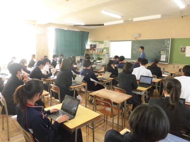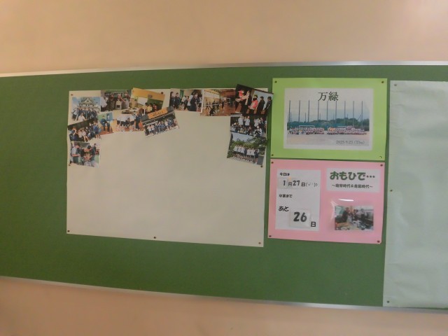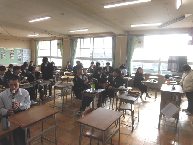 廊下を巡っているととても寒いのですが、写真を撮るため教室に入らせてもらうと温かく、再び廊下に出るのをためらってしまいます。本日6時間目の授業の様子です。1段目の1組は英語です。ALTの先生が来られて授業をしてくださっています。これから生徒達がペアで英会話を行うため、先生がペアを決める指示を出しているところでした。2段目の2組は理科です。生物分野について学習しています。今回の授業では、スライドに表示された生物について思いつくことを、生徒達が次々に発表している姿が見られました。3段目の3組は音楽です。入ったときはちょうど楽器演奏の時間でした。リコーダーやカップスを用いて、各自が演奏やリズム練習を行う様子が見られました。楽しそうな音が、音楽室に響いています。4段目は、学年掲示板の卒業カウントダウンカレンダーです。いよいよ卒業まで30日を切ったことが分かります。来週には2月に入ります。生徒達と過ごせる時間を、引き続き大事にしていきたいと思います。
