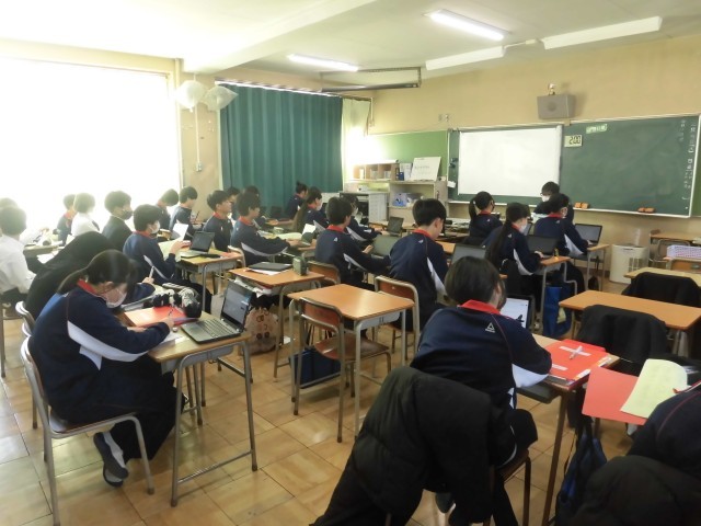 節分を越え、本日が「立春」ということで、暦の上ではありますが、春が始まると聞き、うれしく思っています。足元がまだまだ寒いですが、ここから春が進むと思ってがんばります。本日3時間目の授業の様子です。上段の1組は国語です。「走れメロス」について読解する授業です。気づいたことをタブレットPCに入力することで、生徒達は、お互いの考えを共有することができるようになっており、画面上で話し合いが進んでいます。中段の2組は英語です。英語の聞き取りを行っているところでした。英文が流れる合間に、先生が質問を解説を入れて、しっかり理解が進むようサポートしています。下段の3組は理科です。電圧や電流の特徴を踏まえたプリント問題を解いています。自分達で解き進めたり、先生の解説を聞きながら取り組んだりと、生徒達の個に沿った理解ができるよう授業が展開していました。