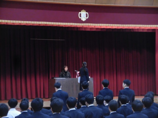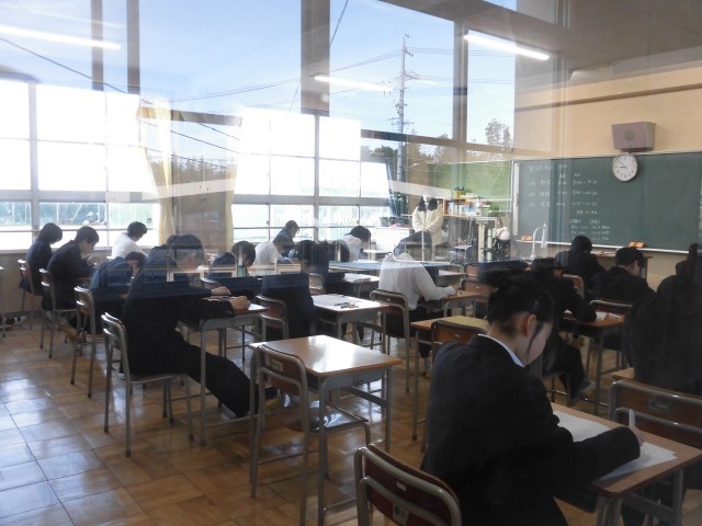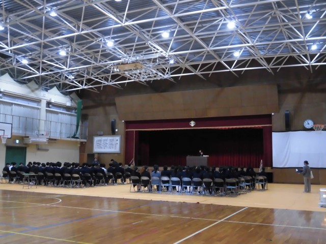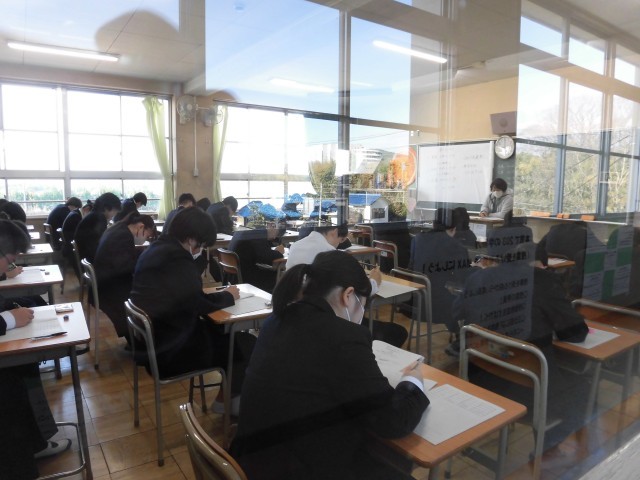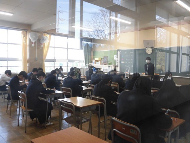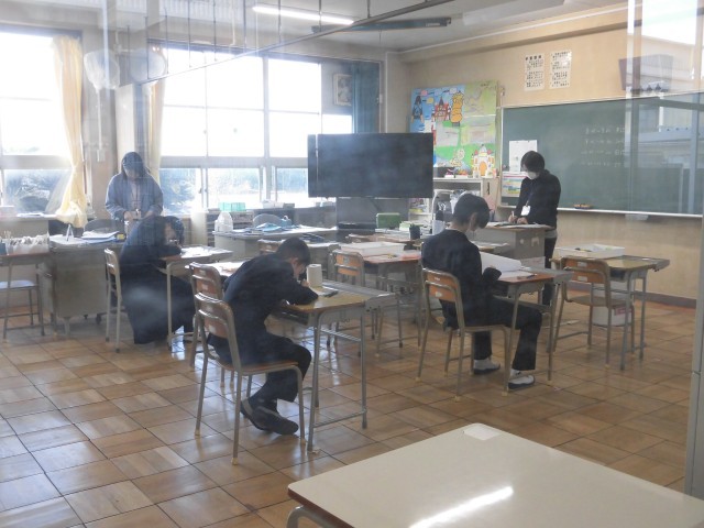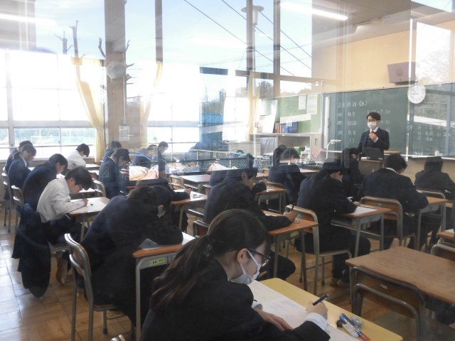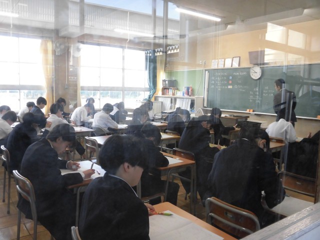 日中の気温は高くなりそうですが、朝の廊下はかなり寒いです。日が高くなるのを待ち遠しく思っています。本日1時間目の各学年の様子です。第3回テストが始まりました。写真は、1~3段目が2年生、4~7段目が1年生、8段目が678組になります。いずれもテストに真剣に取り組んでいる姿が見られました。そして、9~10段目の写真が、3年生になります。3年生は1月に第3回テストを終えているため、この時間は、卒業式に向けた準備に入っています。式を迎えるにあたって、どのような姿勢で臨むのか、学年生徒指導の先生が話をした後、学年主任の先生が証書授与の流れについて、一つ一つ丁寧に説明していました。その話を聞いた生徒達は、座っている間も、懸命に背筋を伸ばして姿勢を整えていました。