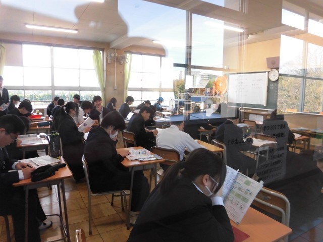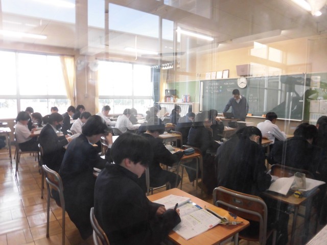 予報によると、そろそろ南風が吹いてまた暖かくなるそうです。「春一番」の風が吹くのももうすぐというところでしょうか。本日朝の登校時間の様子です。8時15分を過ぎた1、2年生のフロアを通ると、写真のようにテスト勉強に取り組む姿が見られました。どうかその努力が報われることを願っています。