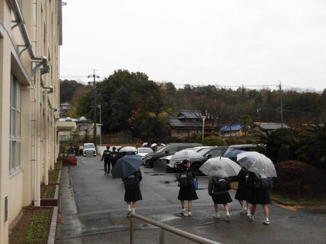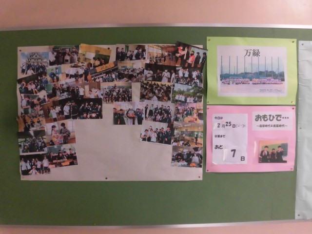 久しぶりの雨の日です。近頃ダムの貯水量が心配されるニュースが多かったので、この雨が解消につながることを願いつつ、一方で、今日は公立入試の日でもあります。受検に向かっている3年生の生徒達が、どうか無事に試験に臨めていることを願います。入試に行っている生徒達が多いため、3年生は3時間目が終了した後に下校となっています。他の学年のことを考えて、速やかに、そして静かに下校してくれています。3年生が帰った後、学年フロアのカウントダウンカレンダーを見ると、卒業までもうあと「7日」になっていました。明日からは、卒業式練習も2年生と合同で行われていく予定です。来週のその時もよい形で向かえることができるよう、職員もより力を合わせて臨んでいきたいと思います。