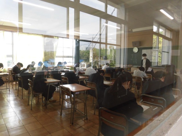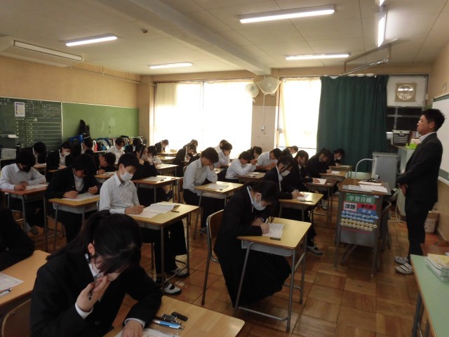 学校が始まって数日、新しいクラスにも慣れてきたところでしょうか。放課の時間には、生徒達が和やかに話し合う姿がよく見られるようになってきました。写真は、本日から始まった学力テストの様子です。上段から1、2、3年生になります。どの学年を見ても、静かに集中して取り組んでいました。このテストは明日も続きます。最初の力試しとして、ぜひがんばってほしいと思います。