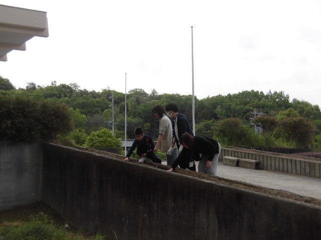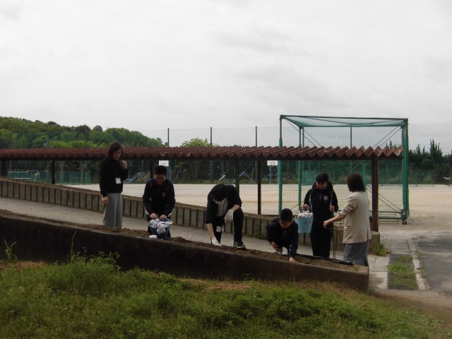 日差しが隠れる程今日は雲が広がっていますが、雨はなんとか降らずにもってくれそうです。今日は授業後に部活動体験もあるので、どうかこの天気のまま続いてほしいと願います。本日1時間目の授業の様子です。技術の時間に畑づくりをしています。校舎前のスロープ脇の土を耕し、肥料を入れるなどの作業に取り組みました。今年度もまた野菜作りに挑戦するようです。これまでの経験を活かし、どのような工夫をすればよりよく育てられるのか、ぜひ探究してほしいと思います。