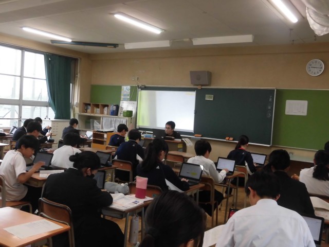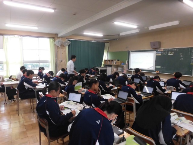 3年生が全国学力状況調査に取り組む中、他学年のフロアは教科の授業を行っています。本日1時間目の授業の様子です。1段目の1組は技術です。甘いミニトマトを育てる工夫はどうすればできるのか、提示された条件を基に、生徒達が思案を巡らす姿が見られました。2段目の2組は社会(地理)です。地形図の学習に取り組んでいます。自分達で、地形図の知識を調べながら、その基本的な事項を自分で説明できるよう、各自がタブレットPCを用いてまとめる姿が見られました。3段目の3組は英語です。ALTの先生が授業を進めています。決められた語句を使いながら、各班で英文を考える課題にチャレンジしていました。4段目の4組は理科です。教科書にある「レポートの書き方」を参照しながら、各自で水溶液の性質をまとめる授業に取り組んでいました。黙々と生徒達が取り組む中、教科書をめくる音、キーボードを叩く音が教室に響いています。