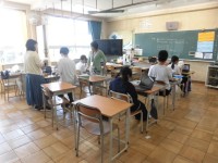 日差しがさらに強くなってきました。2年生の授業の様子です。上段は1組の技術です。エネルギーの問題について、クラスで考えています。中段の2組は音楽です。オペラの魅力について、話し合いをしています。下段は3組の理科です。理科に関することで、各自で調べたいテーマについて調べ学習をしています。