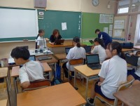 青空を眺めていると、山の方に小さな入道雲のような雲が見られました。早々と夏の空を見たような思いです。本日4時間目の授業です。1段目は1組です。走り幅跳びの記録を測定しています。真剣に各自が跳ぶ様子が見られました。2段目の2組は英語です。先生が示す単語カードに沿って、生徒達が英単語を読み上げています。3段目の3組は美術です。取り組んでいるデッサンが、前よりも進んできています。4段目の4組も英語です。自己紹介の例文を、静かに生徒たちが聞く様子が見られました。