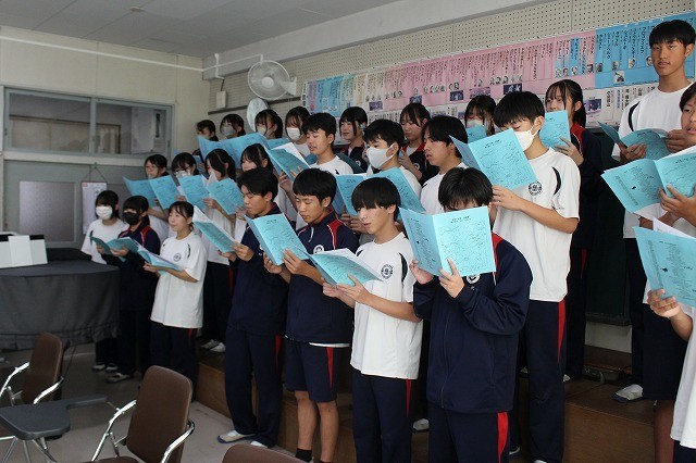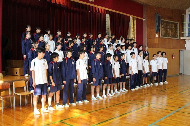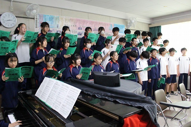 写真は、2年生の学年合唱の練習風景です。入退場から、歌を学年全体で合わせ練習を行いました。