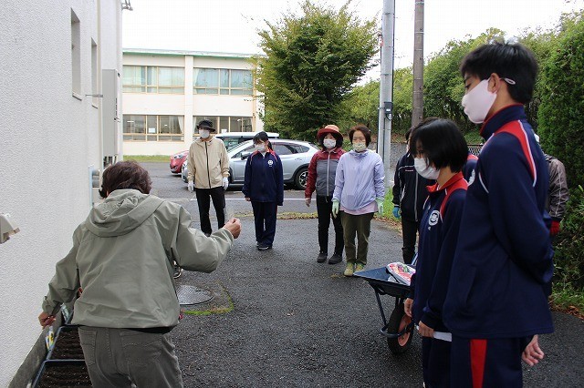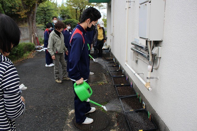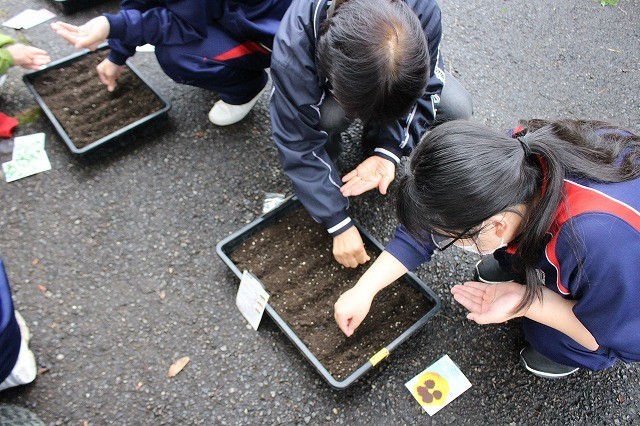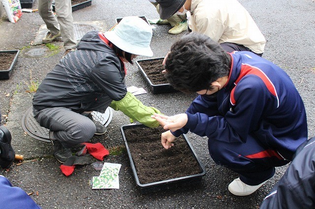 ボランティアの皆様のご指導のもと、生徒たちはパンジーやビオラ、ノースポールなどの花の種をまきました。