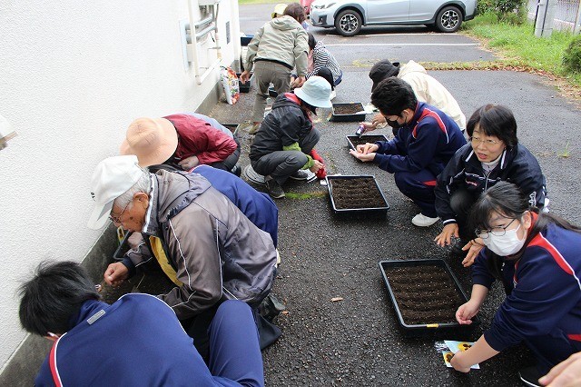 本日、花壇ボランティアの皆様にご来校いただき、5・6組の生徒が一緒に花壇の種まきを行いました。