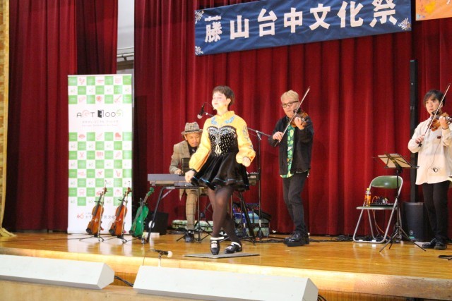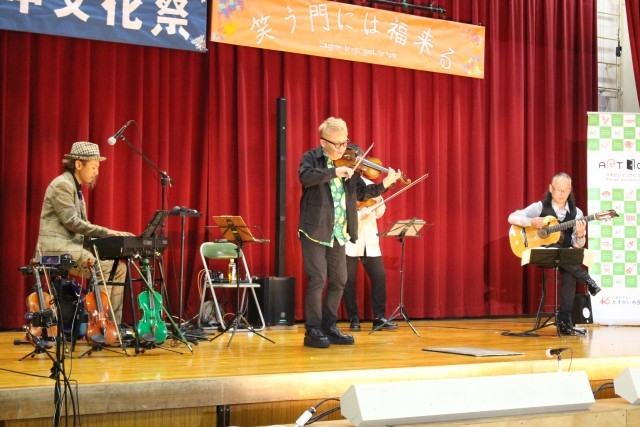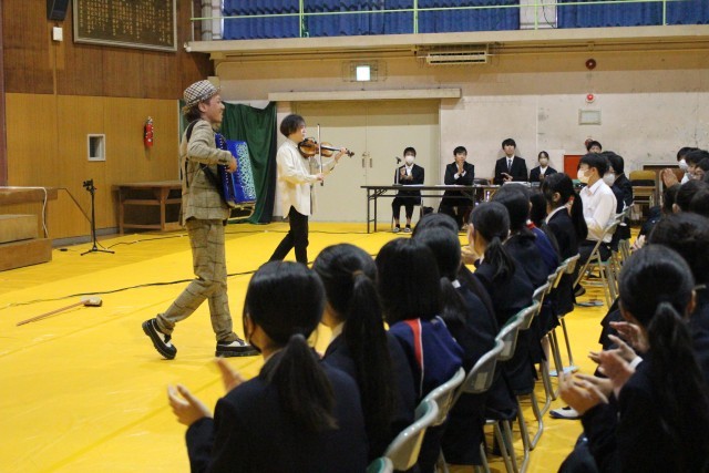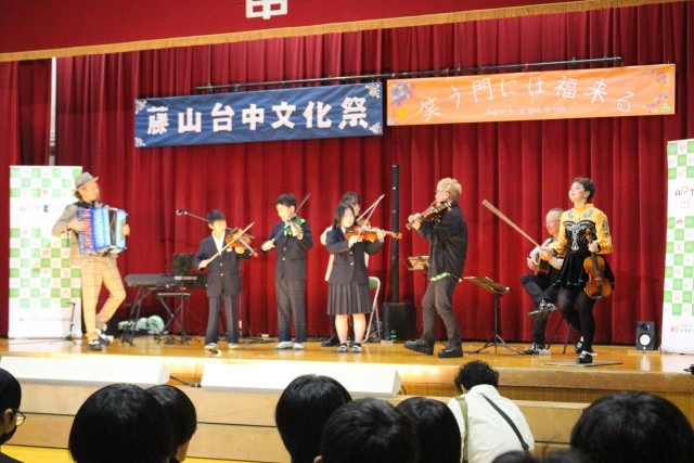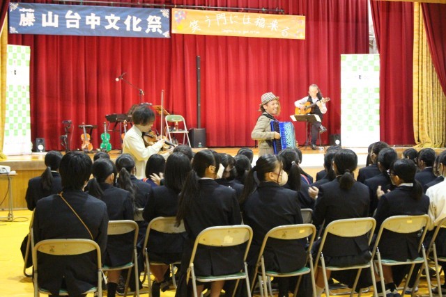 文化祭で芸術鑑賞も行いました。悠情楽団という、バイオリンやギター、キーボードなどを中心にアイルランド等の北欧の音楽を演奏してくださる楽団さんです。曲によっては本場のアイリッシュダンスもダンサーさんに披露していただき、心地よい弦楽器の音とともに盛り上がりました。
